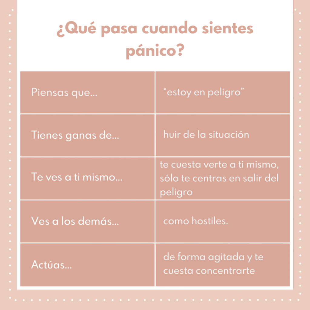 El pánico (como toda estado del sistema nervioso) tiene consecuencias en nuestros pensamientos, sensaciones, percepción del mundo y de nosotros mismos y actos. A nivel gráfico se resume en esto: